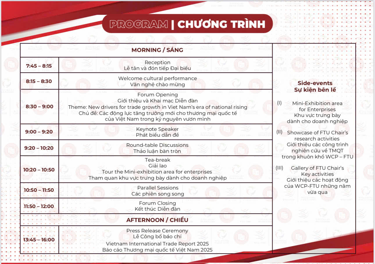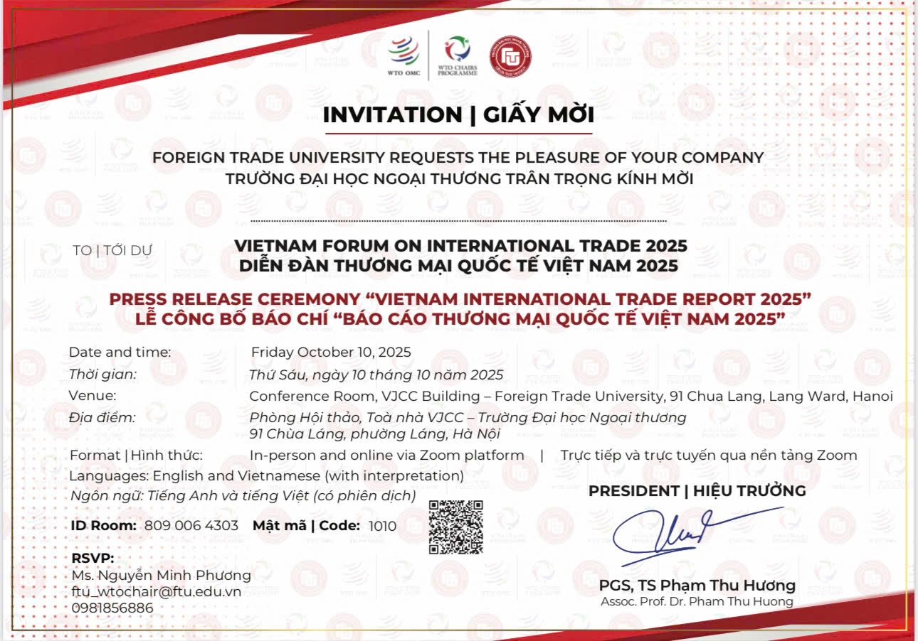 As part of the second Vietnam International Trade Forum (VFIT), the WTO Chair Program at Foreign Trade University will also host the Press Release Ceremony of the Vietnam International Trade Report 2025—a strategic publication reflecting key trends, opportunities, and challenges of global trade for Vietnam. This event provides an opportunity for the drafting team to present the Report’s main findings to scholars, experts, institutions, and the media.