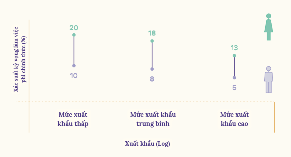Không chỉ mang lại lợi ích về thu nhập, thương mại còn tạo ra những công việc tốt hơn và ổn định hơn cho phụ nữ. Trong các lĩnh vực có tỷ trọng xuất khẩu cao, khả năng phụ nữ làm việc phi chính thức đã giảm từ 20% xuống còn 13%. Mức giảm này đặc biệt ấn tượng ở phụ nữ – 7 điểm phần trăm, cao hơn đáng kể so với 5 điểm phần trăm của nam giới. Điều đó cho thấy hội nhập thương mại có thể mở ra môi trường làm việc chính quy, an toàn và bảo đảm hơn cho lao động nữ.